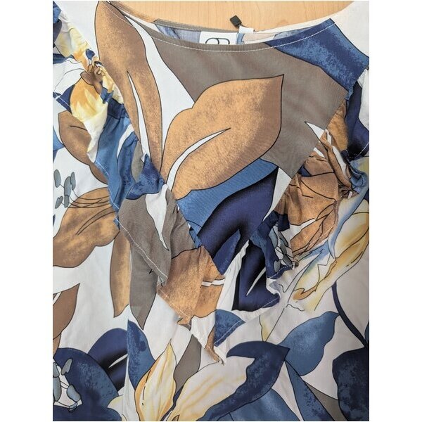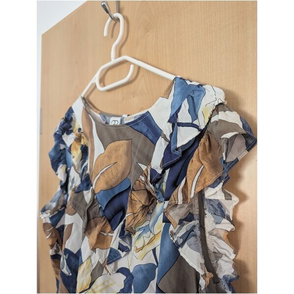 schöne Farbkombi aus Blau-Weiß-Braun-Gelb-Tönen, Rüschen im Brustbereich, süße Flügelärmelchen