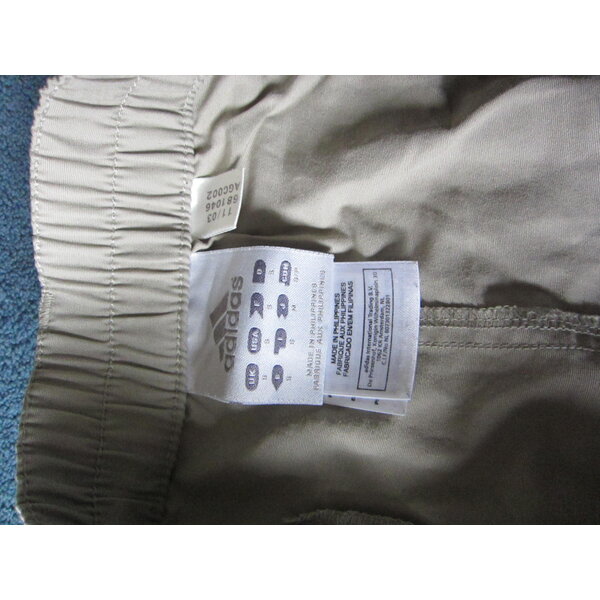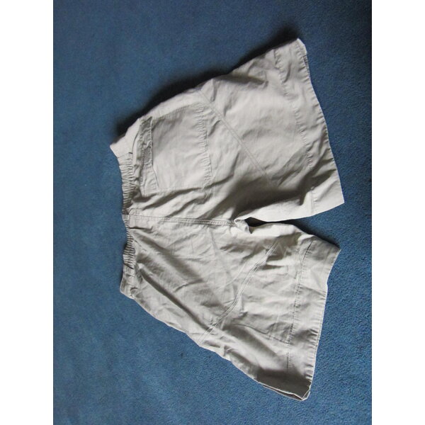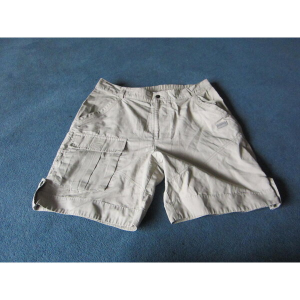 Es handelt sich um eine kurze Hose in einem hellen Beige mit vier Taschen und eine Gummizug im Rücken für guten Sitz. Die Potasche und die Tasche auf dem rechten Bein werden mit einem Klettverschluss geschlossen. Die einfache Bundweite ist 38 cm und die Gesamtlänge 44 cm, endet über den Knieen.