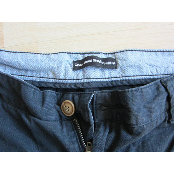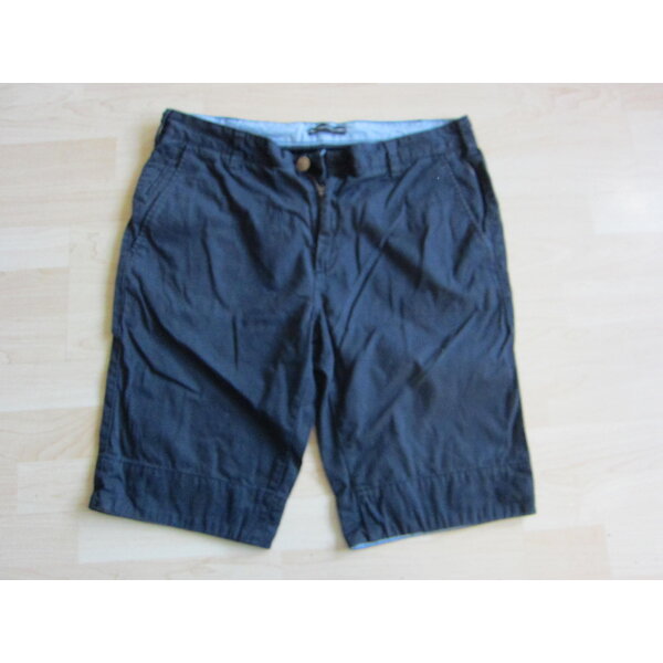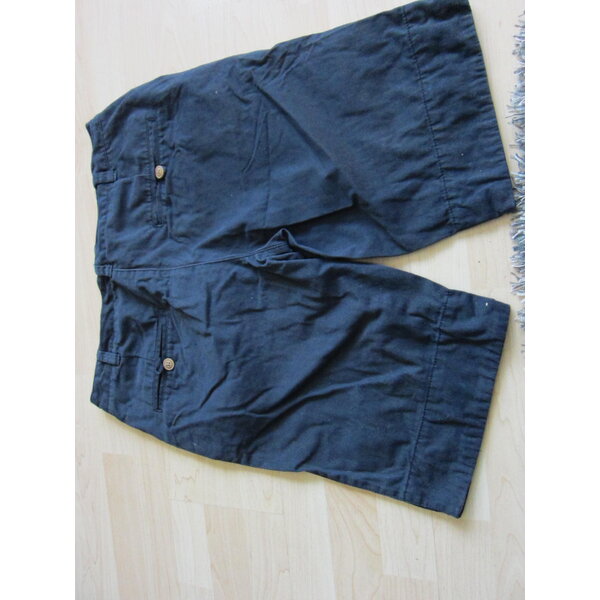 Es handelt sich um eine uni dunkelblaue kurze Hose mit fünf Taschen, zwei normale Eingreiftaschen vorne, zwei Potaschen und in der rechten vorderen Tasche noch eine kleine Tasche für Schlüssel oder ähnliches. Die einfache Bundweite ist 42 cm und die Gesamtlänge 54 cm.