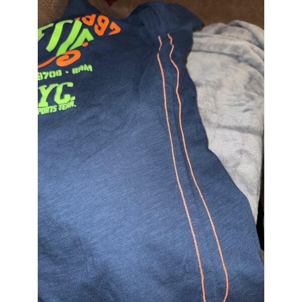 Schönes Langarmshirt von Vingino mit neonfarbigem Aufdruck, auf dem Größenschild steht 18, es entspricht meiner Ansicht nach Gr. 176, an der Seite jeweils 2 orange Streifen