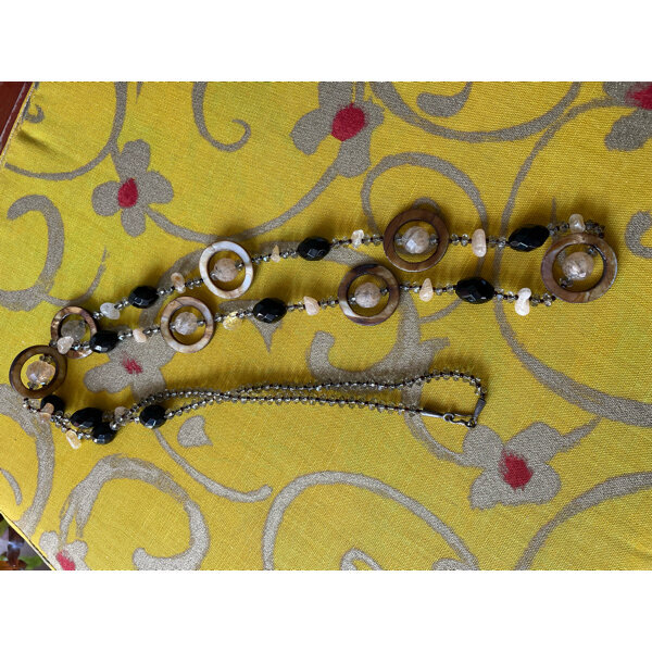 Biete diese Kette (NP 49.-) aus Halbedelsteinen und geschliffenen Glasperlen, die entweder lang oder doppelt getragen werden kann. Verschluss mit versilbertem Haken. Farben Beige, Rauch, Braun & Schwarz. Gewicht ca 100 Gramm. Sehr guter getragener Zustand. Wird gut verpackt verschickt.