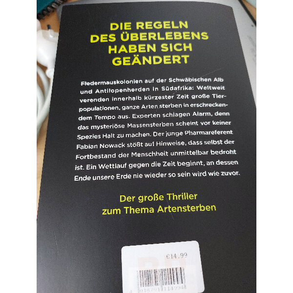 Antilopenherden in Südafrika und Fledermauskolonien auf der Schwäbischen Alb: Weltweit verenden innerhalb kürzester Zeit große Tierpopulationen, ganze Arten sterben in erschreckendem Tempo aus. Experten schlagen Alarm, denn das mysteriöse Massensterben scheint vor keiner Spezies Halt zu machen. Der junge Pharmareferent Fabian Nowack stößt auf Hinweise, dass selbst der Fortbestand der Menschheit unmittelbar bedroht ist. Ein Wettlauf gegen die Zeit beginnt, an dessen Ende unsere Erde nie wieder so sein wird wie zuvor.