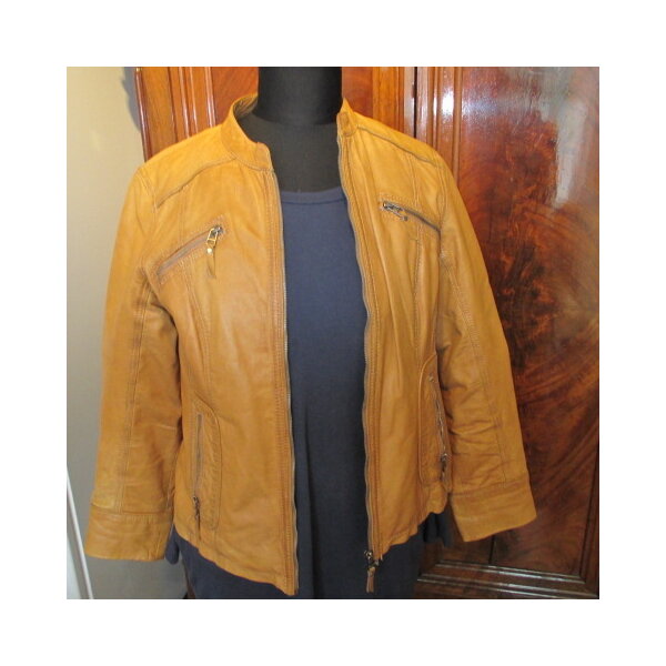 hellbraunes Leder mit weiß-blau geblümten Innenfutter aus Baumwolle - viele RVs - Länge 57 cm - Schulterbreite 42 cm - Achselweite 51 cm - keinerlei Materialschilder vorhanden