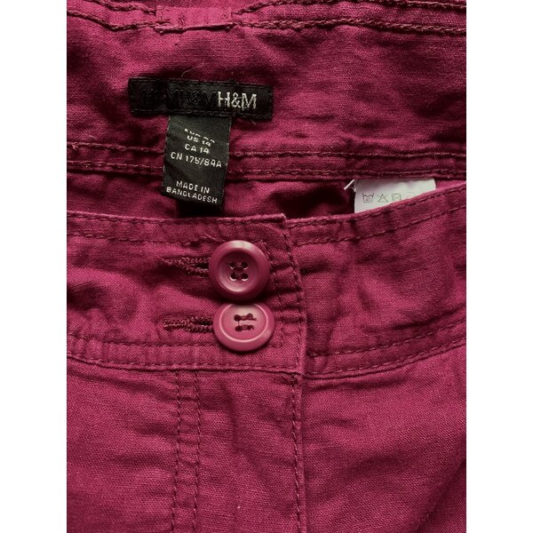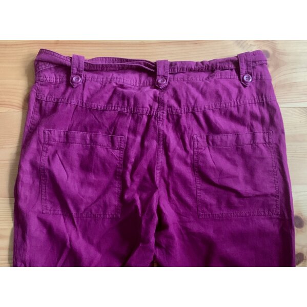 Legere Leinenhose mit abnehmbaren Stoffgürtel - Beine können hochgekrempelt und mit Knopf fixiert werden - lässiger Schnitt, tolle intensive Farbe zwischen weinrot und lila.