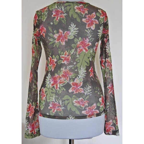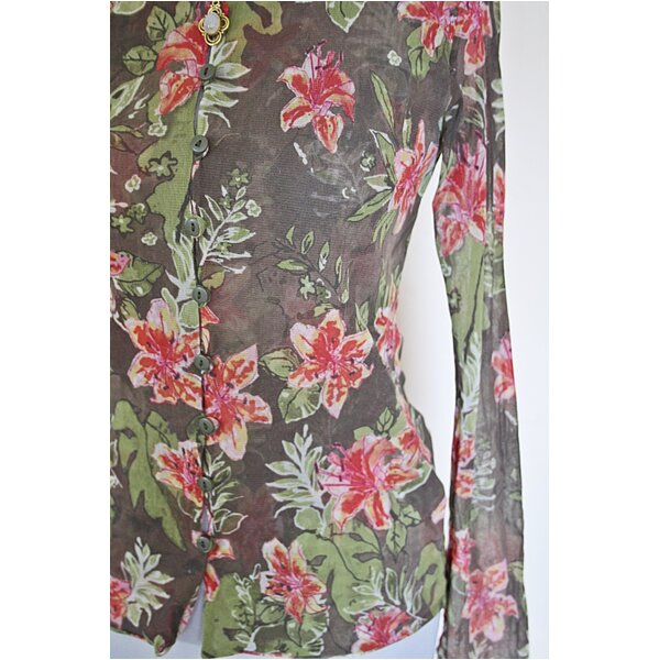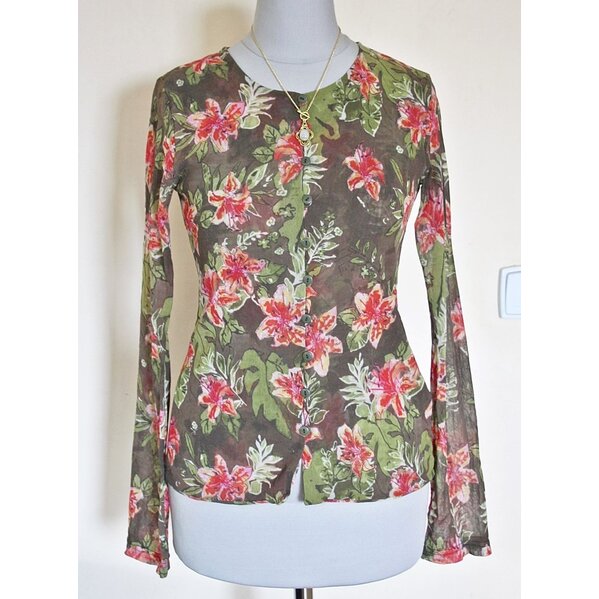 Schönes, elfenhaftes Jäckchen/Bluse aus zartem Netzstoff, mit durchgängiger Knopfleiste und tollem Blumen- und Rankenmuster. Ein Größenetikett ist nicht mehr vorhanden, ich empfehle es bei Gr.34 (die Schneiderpuppe hat die Größe 34/36)
