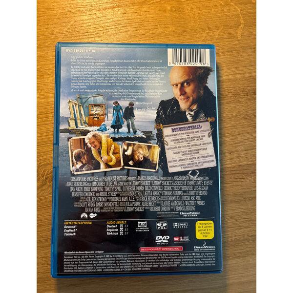 Es betrübt mich sehr, Ihnen mitteilen zu müssen, daß der Film, über den Sie gerade lesen, außergewöhnlich unheilvoll ist. Was in diesem Fall bedeutet, es handelt sich um "ein haarsträubendes Abenteuer dreier erfindungsreicher Waisenkinder und eines düsteren Bösewichts namens Graf Olaf, der es auf ihr enormes Vermögen abgesehen hat". Sie werden darin einem verheerenden Feuer, delikater Pasta, Jim Carrey, schlecht erzogenen Blutegeln, einer riesigen Schlange, Meryl Streep und einem Hochstapler namens Jude Law begegnen. Das Einzige, wodurch man bei diesem Spektakel noch mehr aus der Fassung geraten könnte, sind Extras wie Kommentare von mir oder unheimlich unveröffentlichte & vermaledeit verpatzte Szenen...