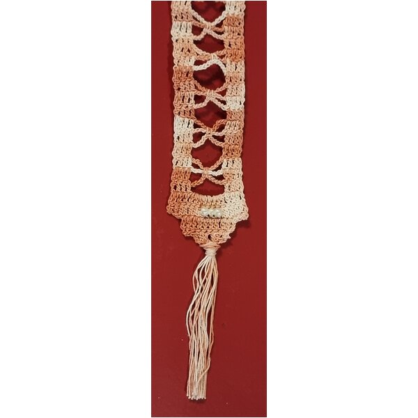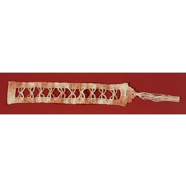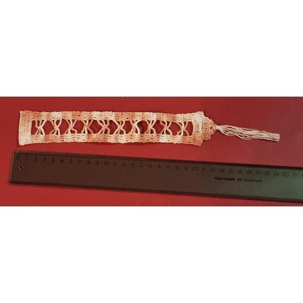 rosa/weiß neu gehäkeltes Lesezeichen. Länge mit Fransen ca. 30 cm. An der Seite mit den Fransen sind 7 kleine Perlen aufgenäht