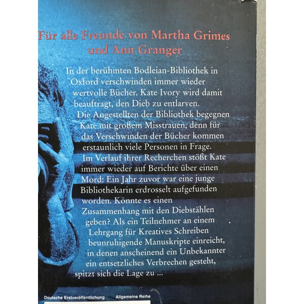 In der berühmten Bodleian-Bibliothek in Oxford verschwinden immer wieder wertvolle Bücher. Kate Ivory wird damit beauftragt, den Dieb zu entlarven. Die Angestellten der Bibliothek begegnen Kate mit großem Misstrauen, denn für das Verschwinden der Bücher kommen erstaunlich viele Personen in Frage. Im Verlauf ihrer Recherchen stößt Kate immer wieder auf Berichte über einen Mord: Ein Jahr zuvor war eine junge Bibliothekarin erdrosselt aufgefunden worden. Könnte es einen Zusammenhang mit den Diebstählen geben? Als ein Teilnehmer an einem Lehrgang für Kreatives Schreiben beunruhigende Manuskripte einreicht, in denen anscheinend ein Unbekannter ein entsetzliches Verbrechen gesteht, spitzt sich die Lage zu ...