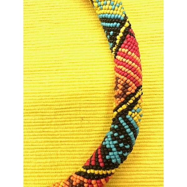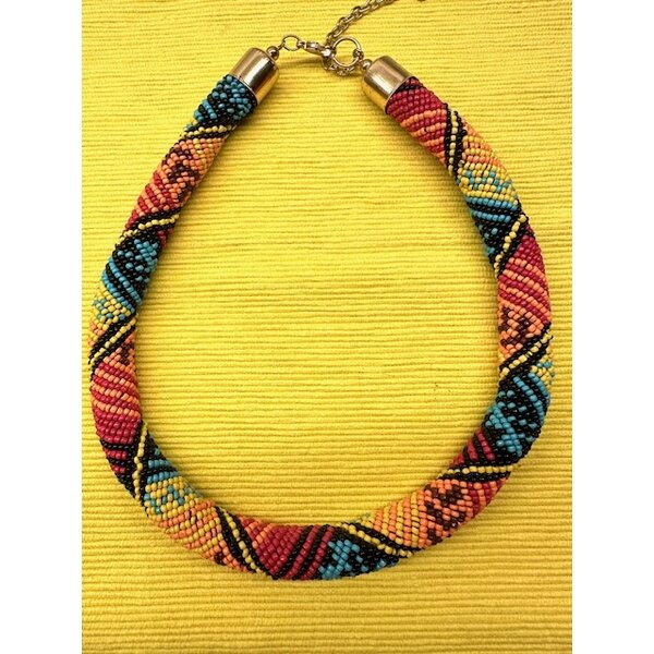 Ausgefallener Halsreif aus vielen bunten kleinen Perlen mit goldfarbenen Endkappen und Verlängerungskettchen.