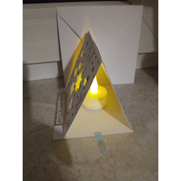 Wenn in die aufgestellte Karte ein elektrisches Teelicht gestellt wird, leuchten die Sterne