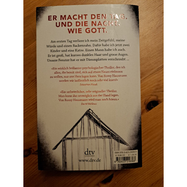 Am ersten Tag verliere ich mein Zeitgefühl, meine Würde und einen Backenzahn. Dafür habe ich jetzt zwei Kinder und eine Katze. Einen Mann habe ich auch. Er ist groß, hat kurzes dunkles Haar und graue Augen. Unsere Fenster hat er mit Dämmplatten verschraubt