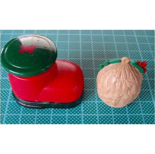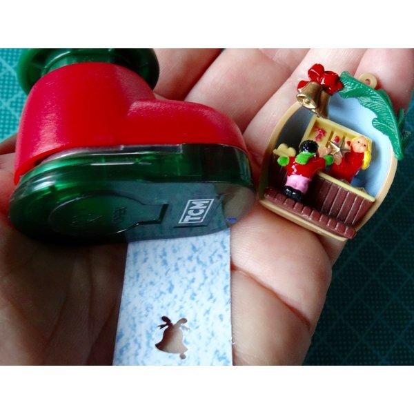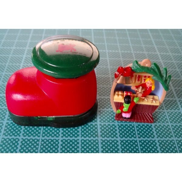 für den Adventskalender: kleiner Locher, der ein Glockenmotiv stanzt und eine kleine halbe Walnuss mit niedlichem Weihnachtsstand