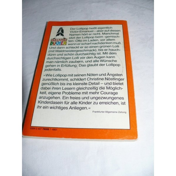 Der Lollipop heißt eigentlich Victor Emanuel - aber auf diesen Namen hört er nicht. Manchmal sitzt der Otto beim 'gemischten' Otto im Laden, vor allem, wenn er scharf nachdenken muss. Und dann schleckt er so einen grünen Lolli (mit Waldmeistergeschmack), bis er hauchdünn und schön durchsichtig ist. Mit dem durchsichtigen Lolli vor den Augen kann man nämlich zaubern, und alle Wünsche gehen in Erfüllung. Das glaubt der Lolli jedenfalls.