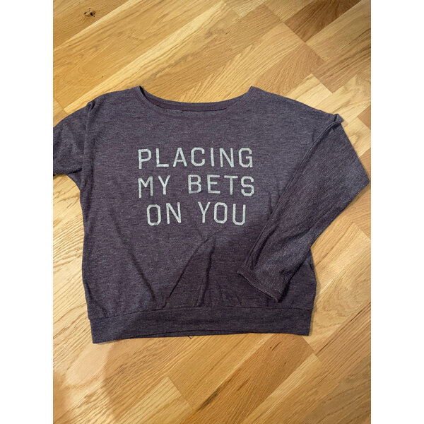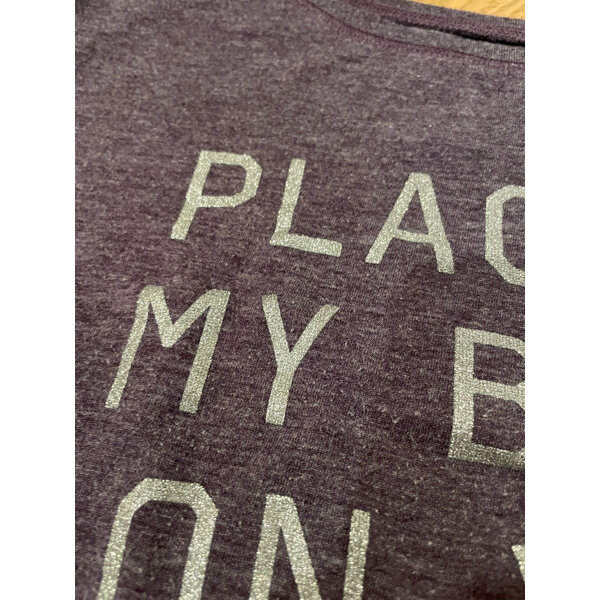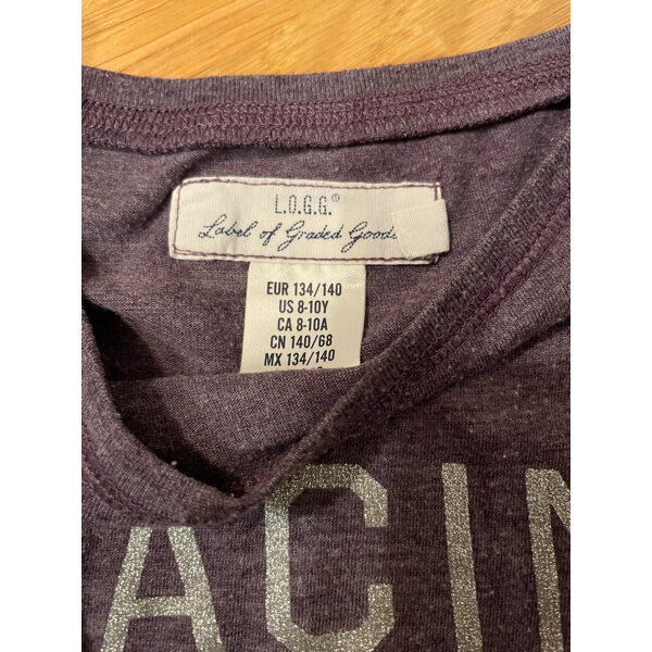 Longsleeve in lila mit glitzernder Schrift.