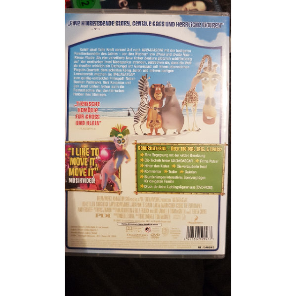 "Schiff ahoi und volle Kraft voraus. Auf nach "Madagascar" zur lustigsten Tierverschwörung aller Zeiten!Als vier verwöhnte Zootiere aus New York plötzlich schiffbrüchig auf der exotischen Insel Madagaskar landen, müssen sie entdecken: Die Welt da draußen ist wirklich ein Dschungel! Der eitle Löwe Alex (Jan Josef Liefers), die divenhafte Nilpferddame Gloria, die immer ängstliche Giraffe Melman (Bastian Pastewka) und das abenteuerlustige Zebra Marty (Rick Kavanian) schlittern, mit tatkräftiger Unterstützung des verrückten Pinguin-Quartetts (Die Fantastischen Vier), von einem Abenteuer ins nächste! Auch der schrille König Julien und sein lustiges Lemurenvolk machen diesen turbulenten Dschungeltrip zu einem quirlig-verrücktem Filmspaß für die ganze Familie!