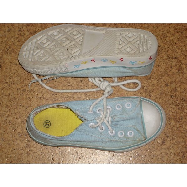 getragene, aber noch gut erhaltene Mädchen-Turnschuhe/Sportschuhe/Leinenschuhe zum Schnüren mit gewollt ausgefransten Nähten.