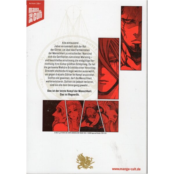 "Record of Ragnarok". Heftausgabe, ca. 96 Seiten. Manga Cult. Alle eintausend Jahre versammelt sich der Rat der Götter, um über das Fortbestehen der Menschheit zu entscheiden. Nun sind sich die Gottheiten zum ersten Mal einig – und beschließen einstimmig die endgültige Vernichtung ihrer bisher größten Schöpfung. Da hat die gerissene Walküre Brünhilde einen Vorschlag: Dreizehn sterbliche Krieger werden auserwählt, um gegen dreizehn Götter im Kampf anzutreten. Sollten sie gewinnen, darf die Menschheit weiterexistieren. Sollten sie jedoch verlieren, sind sie alle dem Untergang geweiht