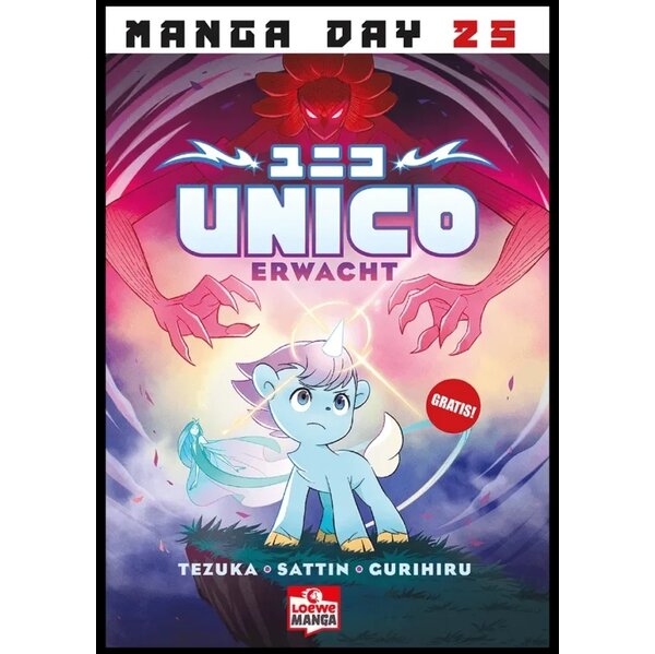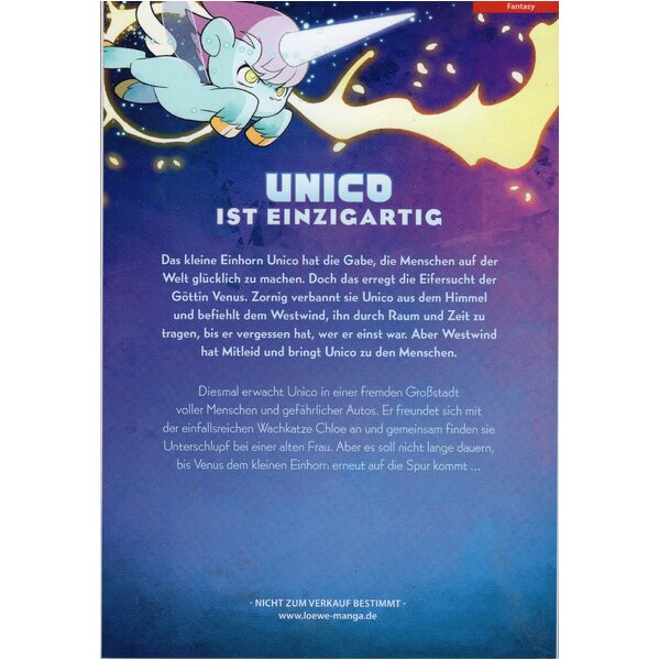 "Unico erwacht". Heftausgabe, ca. 96 Seiten. Loewe Manga. Ein unvergessliches Abenteuer durch Raum und Zeit! Das kleine Einhorn Unico hat die Gabe, die Menschen auf der Welt glücklich zu machen. Doch das erregt die Eifersucht der Göttin Venus. Zornig verbannt sie ihn aus dem Himmel und befiehlt dem Westwind, Unico durch Raum und Zeit zu tragen, bis er vergessen hat, wer er einst war. Aber Westwind hat Mitleid und bringt Unico zu den Menschen. Diesmal erwacht Unico in einer fremden Großstadt, voller Menschen und gefährlicher Autos. Er freundet sich mit der einfallsreichen Wachkatze Chloe an und gemeinsam finden sie Unterschlupf bei einer alten Frau. Aber es soll nicht lange dauern, bis Venus dem kleinen Einhorn erneut auf die Spur kommt.