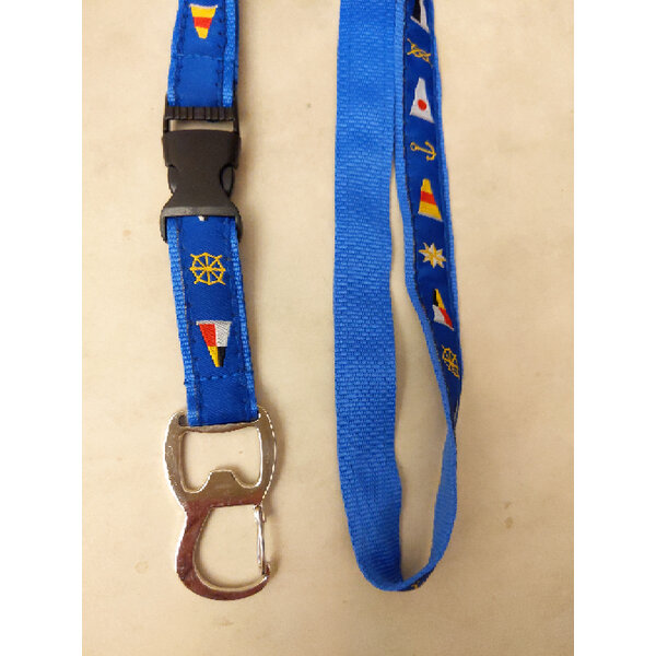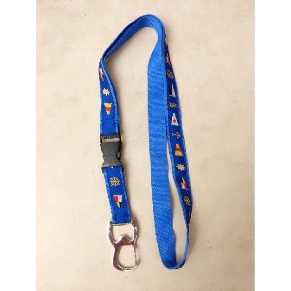 Schönes Schlüsselband mit aufgenähtem Webband mit maritimen Motiven, silberner Karabiner, der untere Teil ist durch per Schnappverschluss an- und abzumachen.