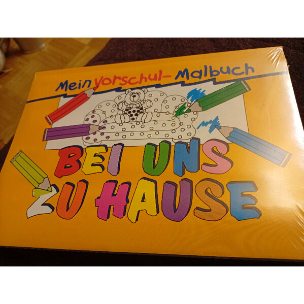 Das abgebildete Produkt ist ein Vorschul-Malbuch mit dem Titel "Mein Vorschul-Malbuch BEI UNS ZU HAUSE".