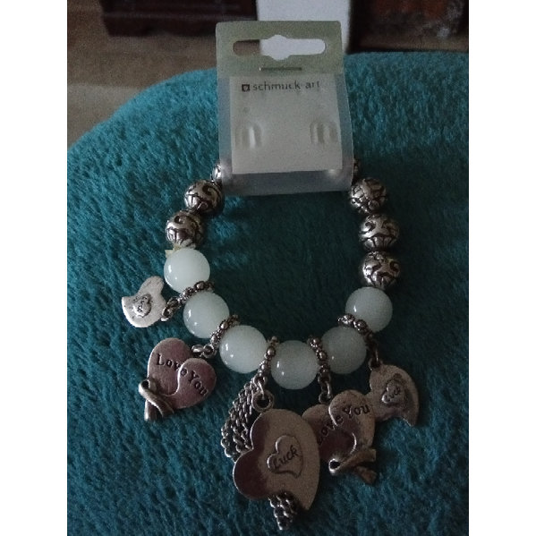 Hübsches Modeschmuckarmband, mit verschiedenen silberfarbenen Anhängern, Gummizug, helle Kugeln, silberfarbene Kugeln, einfach gemessener Durchmesser 6 cm, kann gedehnt werden durch den Gummizug