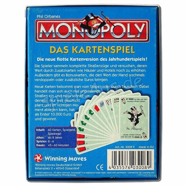 Beim Monopoly-Kartenspiel sammeln die Spieler komplette Straßenzüge und versuchen, deren Wert durch Zusatzkarten wie Häuser und Hotels noch zu erhöhen. Außerdem gibt es Bonuskarten, die den Wert der gesammelten Karten nochmals verdoppeln oder zusätzliche Euros bringen. Neue Karten bekommt man vom Stapel oder durch Tauschen. Dabei bekommt man auch schon mal unpassende Straßen-Karten auf die Hand und muss schnell umdenken. Nur wer geschickt plant und im richtigen Moment ablegen kann, hat als Erster 10.000 Euro - und gewinnt.