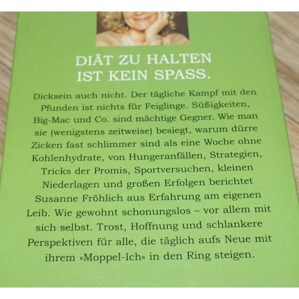 Diät zu halten ist kein Spaß. Dicksein auch nicht. Der tägliche Kampf mit den Pfunden ist nichts für Feiglinge. Süßigkeiten, Big-Mac und Co sind mächtige Gegner. Wie man sie (wenigstens zeitweise) besiegt, warum dürre Zicken fast schlimmer sind als eine Woche ohne Kohlenhydrate, von Hungeranfällen, Strategien, Tricks der Promis, Sportversuchen, kleinen Niederlagen und großen Erfolgen berichtet Susanne Fröhlich aus Erfahrung am eigenen Leib. Wie gewohnt schonungslos - vor allem mit sich selbst. Trost, Hoffnung und schlankere Perspektiven für alle, die täglich aufs Neue mit ihrem „Moppel-Ich“ in den Ring steigen.
