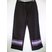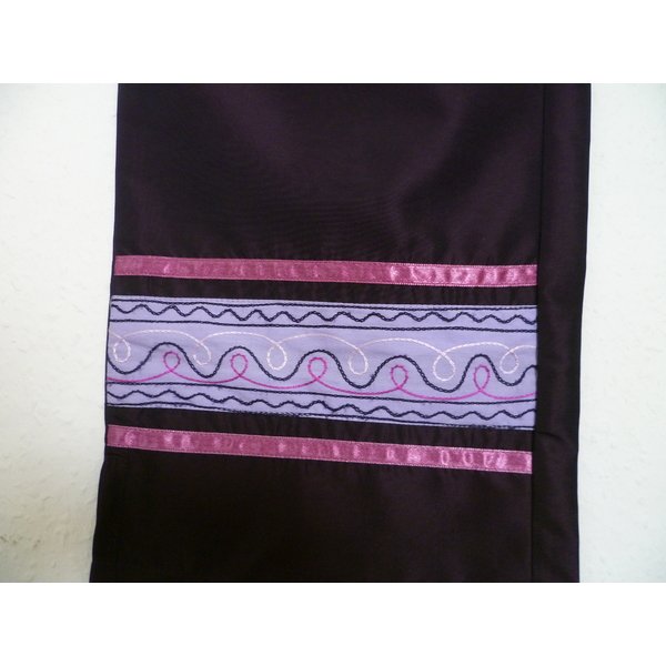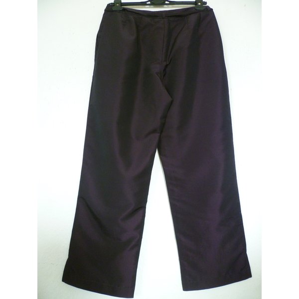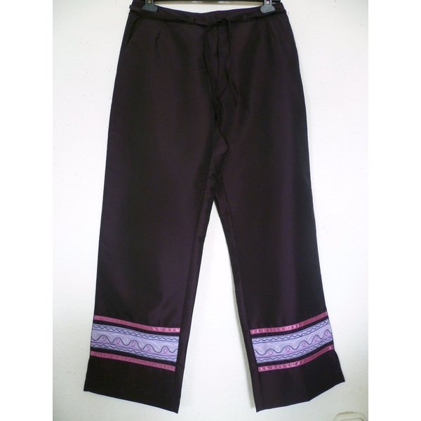 Zauberhafte Hose aus leicht glänzendem Satin in Lila (Aubergine) mit farblich passenden Bordüren am Beinende und kleinen Schlitzen. Die Hose hat ein schmales Bündchen mit kleinen Schlaufen und einem Bindeband.