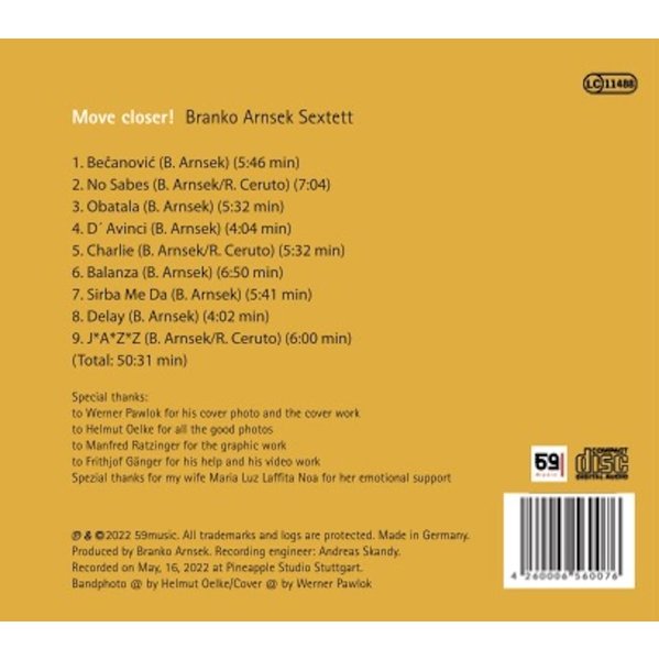 OVP - Digipack in Folie! --- --- --- "Das Debut Album „Move closer!“ des im ehem. Jugoslawien geborenem Jazz-Bassisten Branko Arnsek ist ein Resümee seines langjährigen musikalischen Schaffens. Es ist der erste von vielen seiner Tonträger der diesmal auch seinen Namen trägt. Dafür hat er junge Musiker um sich geschart, die mit dem Material umgehen können, welches Einflüsse vom Balkan bis Kuba im modernen Jazzgewand beinhaltet. Komponieren war schon immer eine seiner Stärken und wird mit dieser Scheibe wieder unter Beweis gestellt. Im zeitgenössischen Jazz ist es inzwischen auch nicht mehr notwendig auf Groove und Funktionsharmonik zu verzichten um Neues zu schaffen. Es ist eher das Erlebnis des Zuhörers es vielleicht schon gehört zu haben um dann doch zu merken, dass es ganz anders ist. In diesem Sinne ... Zum Beispiel hat Arnsek Errungenschaften aus dem HipHop wie 5 über 4 eines JDilla im Stück D ́Avinci verwendet. Zur Erinnerung an D ́Angelo übrigens. Als Kenner der Afro- kubanischen Folklore kommen aber auch seltene Rhythmen wie Makuta oder auch Rumba Obatala in seinen Stücken zum tragen. Man höre den gleichnamigen Titel Obatala und wird verstehen woher der Jazz seinen Drive bezieht. Dafür hat er übrigens eigens eine Rhythmusgruppe bestehend aus ihm selbst am Kontrabass und E-Bass, Frank Eberle am Piano / E-Piano sowie Michael Mischl am Schlagzeug und Reinier Ceruto an den Congas und Batas in die Band geholt. Wie schon Sonny Rollins oder auch Ahmad Jamal das percussive Element in ihrer Jazzband hervorgehoben haben, tut dies Arnsek mit zwei in der kubanischen Musik bewanderten Musikern, Mischl und Ceruto. Der Percussionist Reinier Ceruto selbst ist aus Habana. Bečanović ist die Hommage an einen verstorbenen Musikerfreund und wie der Name schon vermuten lässt an Musik vom Balkan und Jazz. Ein Hörgenuss sind die beiden jungen Bläser Anton Mangold am Altsaxophon und Janos Löber an der Trompete. In Delay und Sirba me da sind beide zu hören." (Apropos Jazz)