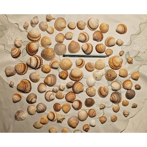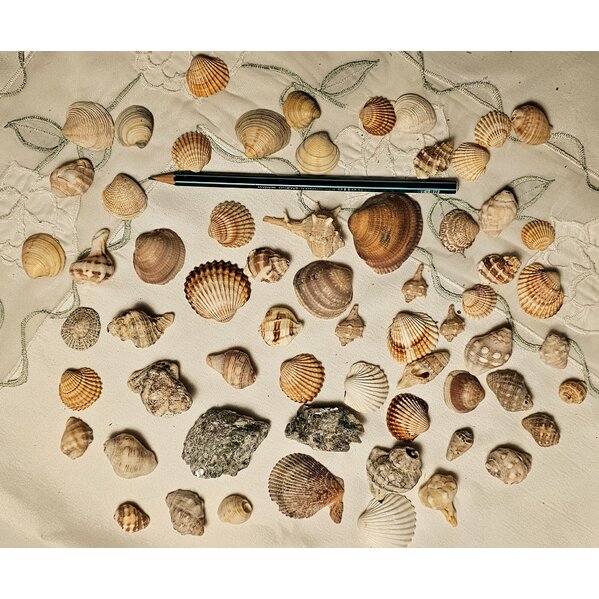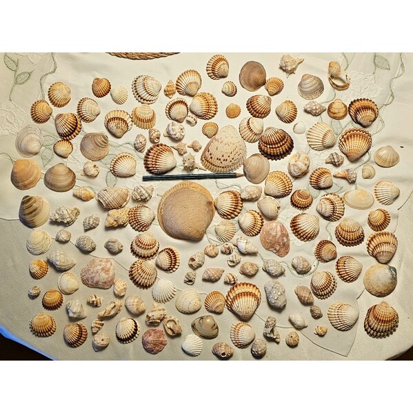 Der Umfang der Muschelsammlung entspricht der Summe der abgebildeten Muscheln aller drei Fotos zusammen