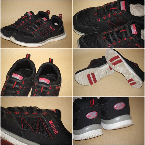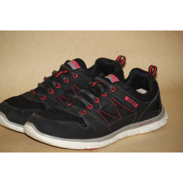 sportliche Sneaker von Mustang in Größe 44. Die Schuhe überzeugen durch ihr modernes Design in Schwarz mit roten Akzenten und sind ideal für Freizeit und Alltag geeignet.