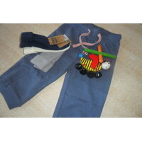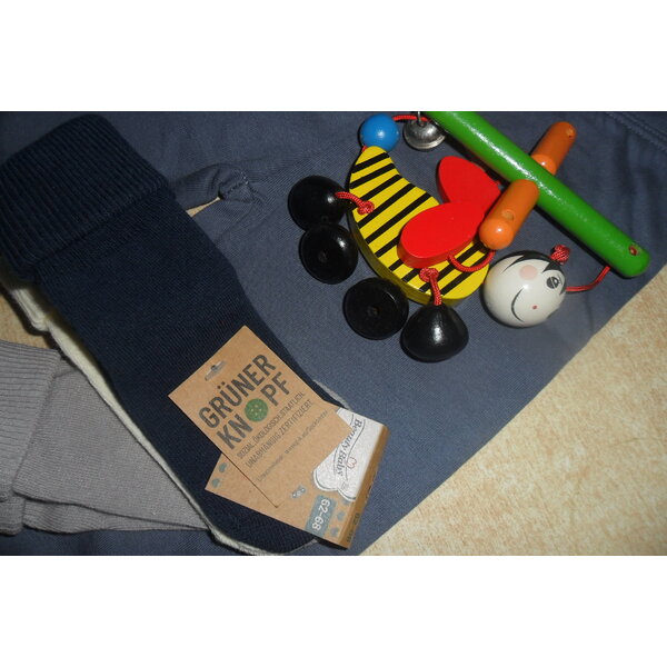 Neue Sweathose aus 100% Baumwolle, innen leicht angeraut, sowie 3 Paar neue Babysöckchen mit Umschlag, dunkelblau, hellgrau und creme, in Grösse 62/68, dazu ein neues Holzspielzeug, Details siehe Bilder