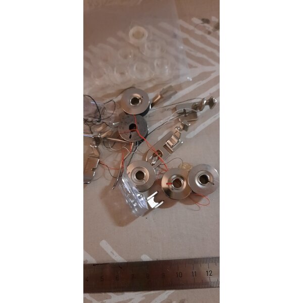 Schachtel mit metallspulen , viele Grössen und Farben , Nähfüsse sind auch dabei ,