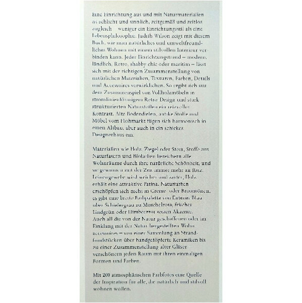 Eine Einrichtung aus und mit Naturmaterialien ist schlicht, sinnlich und weniger Einrichtungsstil als Lebensphilosophie. Judith Wilson zeigt, wie man natürliches Wohnen mit einem stilvollen Interieur verbinden kann. Jeder Einrichtungstrend – ob modern, ländlich, Retro oder maritim – lässt sich mit der richtigen Zusammenstellung von natürlichen Materialien, harmonischen Farben und raffinierten Accessoires verwirklichen. • Das Buch zum Wohntrend – 200 inspirierende Farbfotos voller Anregungen. • Für jeden Raum und alle Einrichtungsstile. • Praktische Tipps u.a. zur Behandlung von Holzböden, zu Biofarben uvm. • Bezugsquellen und Adressen.