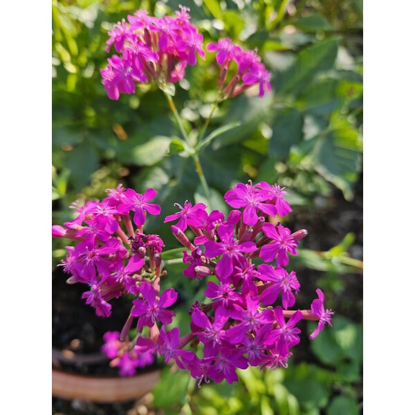 Nelken-Leimkraut, Silene armeria, wächst wild im Mittelmeerraum, bei uns wohl idR einjährig, die Pflanze hat blaugrüne Blätter und magentarote Blüten. Interessant ist, dass die Blüten von Schmetterlingen besucht werden.