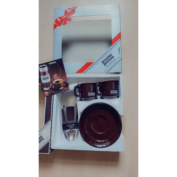 In Originalverpackung. Das Kaffeepulver fehlt, das Geschirr ist noch unbenutzt. Verpackung mit Gebrauchsspuren (siehe Fotos).