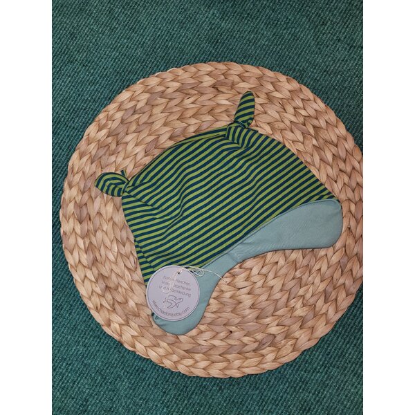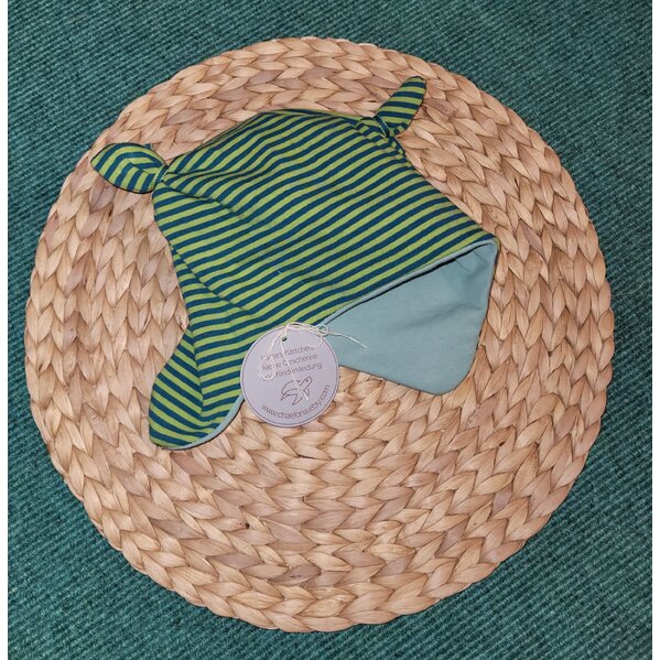 Niedliche Kindermütze mit Ohrenklappen und abgebundenen Ecken, die wie kleine Öhrchen aussehen.
