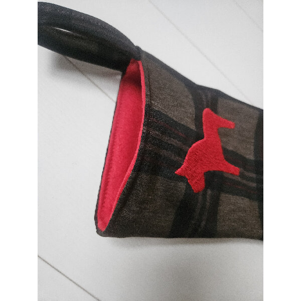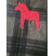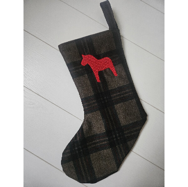 gefertigt aus dunklem kariertem Stoff, bestickt mit rotem Dalarnapferd, gefüttert in rot