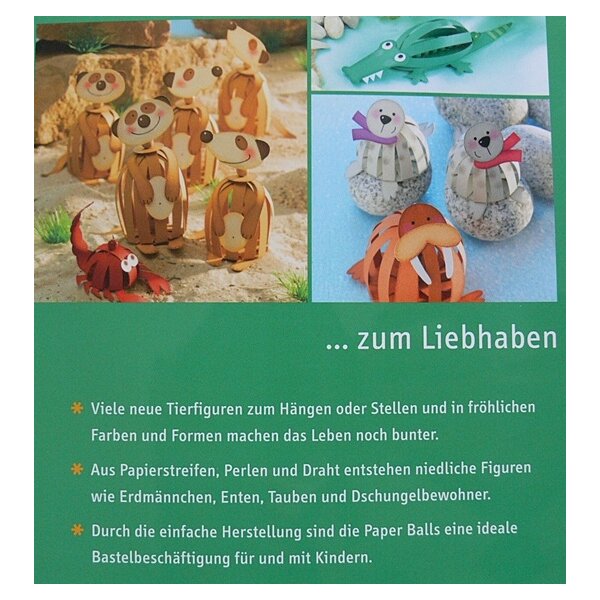 Noch mehr tierische Paper Balls. Neue Tierfiguren aus Papierstreifen. Viele neue Tierfiguren, die das Leben bunter und fröhlicher machen. Aus Papierstreifen mit Perlen und Draht gearbeitet. Ideale Bastelbeschäftigung für und mit Kindern. Kreativ-Softcover, 32 Seiten, 17 x 22 cm, Umschlagklappen, perforierte Vorlagenbogen, Einsteckhüllen.