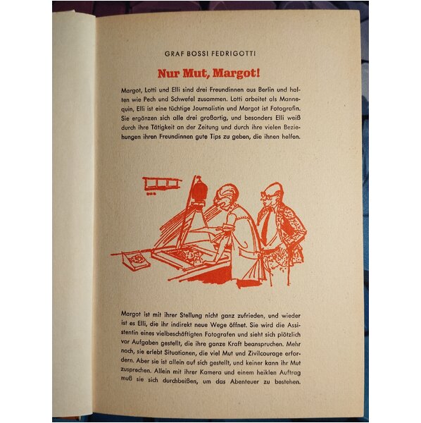 Drei Freundinnen aus Berlin: Junge, frische und unternehmungslustige Mädel sind Lotti, Margot und Elli, die trotz ihrer verschiedenen Begabungen eine ehrliche und herzliche Zuneigung miteinander verbindet. Sie haben bereits einen Beruf, doch eine jede möchte es weiterbringen.Sie wissen, daß ihnen nichts geschenkt werden wird, und haben sich fest versprochen, einander zu helfen, wo immer es möglich sein wird. Wie das im heutigen Leben und Treiben der Insel "Berlin" geschieht und zu welch komödienhaften Irrungen es gelegentlich führt, schildern unsere drei gleichzeitg erscheinenden Bände von Graf Bossi Fedrigotti. - Band 3 - Nur Mut Margot