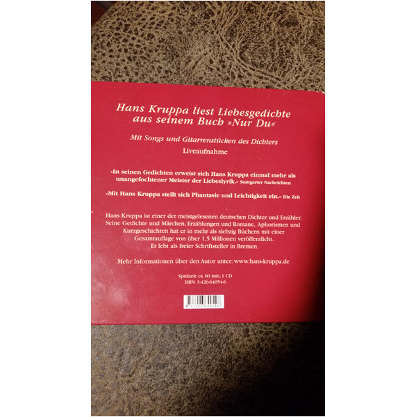 Schon lange hatte Hans Kruppa den Wunsch, seine Gedichte und seine Musik in einem Projekt zu vereinen. Auf dieser CD ist er Wirklichkeit geworden.Inhalt: Hans Kruppa liest Liebesgedichte aus seinem Buch Nur DuHans Kruppa: Gitarre und GesangLea Finn: Gesang