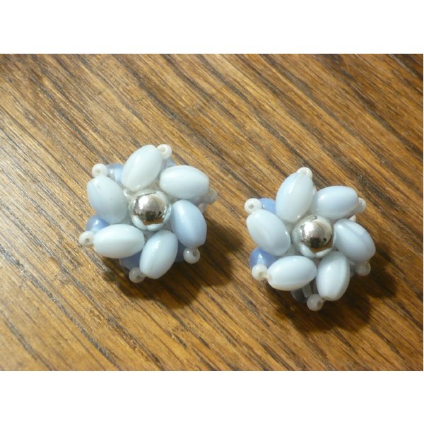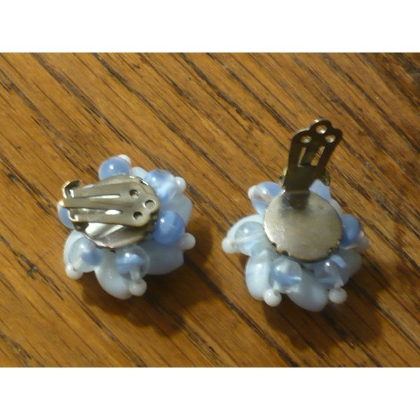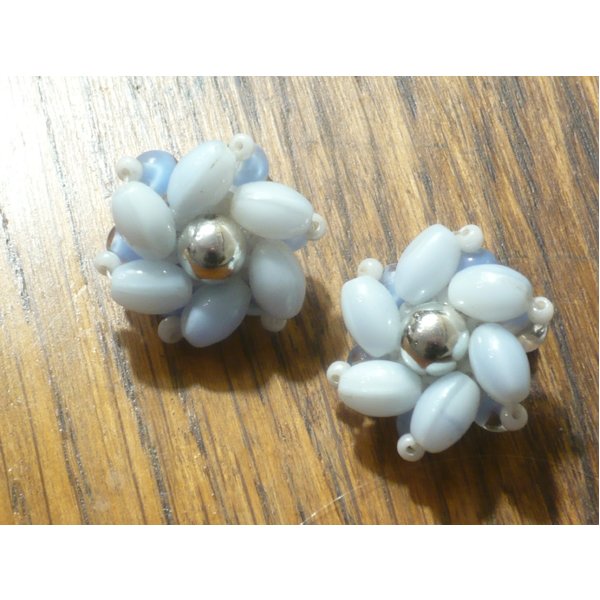 Ohrclips aus den 60er Jahren: hellblaue Glasperlen auf Perlon aufgefädelt wie Blumen.