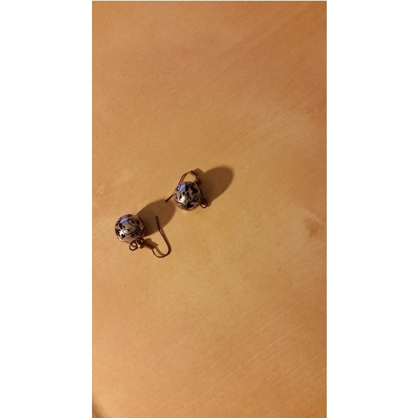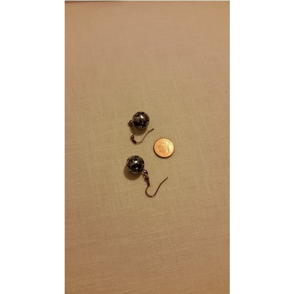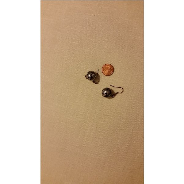 Zwei Ohrhänger mit Kugel, ungefähr in der Größe eines Cents, siehe Foto. Mit floralem Muster in schwarz auf silber.