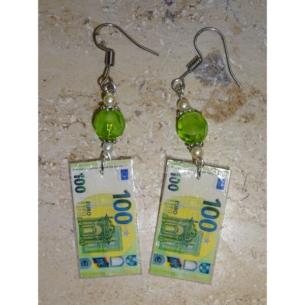 Ohrringe aus laminierten, kleinen "100-Euro-Scheinen" und grünen Glasschliffperlen. Die Gesamtlänge beträgt ca. 7 cm. Die Miniatur-Geldscheine messen ca. 1,6 x 3 cm. Diese sind beidseitig bedruckt (Rückseiten sind ebenfalls einem tatsächlichen Geldschein nachempfunden) und sehr detailreich. :o)
