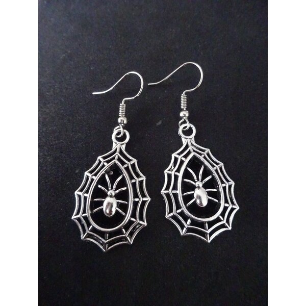 Ohrringe mit Spinnen im Netz, ca. 5 cm lang, silberfarben.