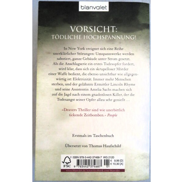 New York wird von einer beispiellosen Anschlagserie in Atem gehalten. Der Attentäter tötet mit einer Waffe, die ebenso unsichtbar wie allgegenwärtig ist: Elektrizität. Angesichts immer neuer Opfer machen sich der gelähmte Ermittler Lincoln Rhyme und seine Assistentin Amelia Sachs auf die Jagd nach einem Täter, der kaum mehr als ein Phantom zu sein scheint. Doch Lincoln Rhyme weiß, dass ihr Gegner allzu real ist – ein gnadenloser Killer, dem das Spiel mit der Angst seiner Opfer große Freude bereitet …