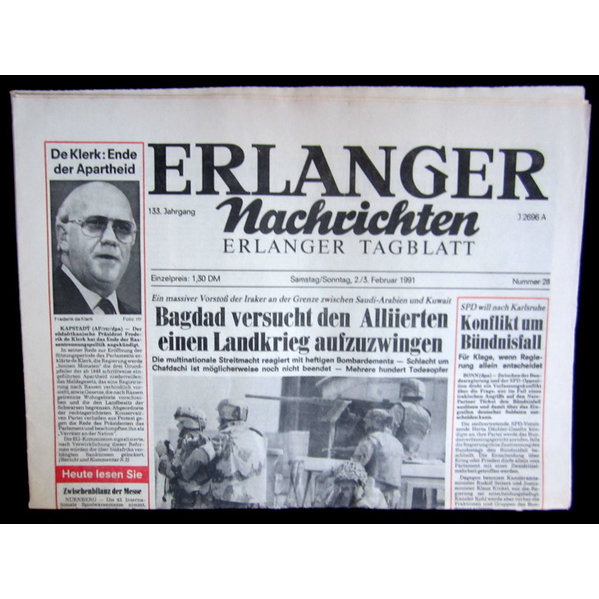 Es handelt sich bei dieser Zeitung um die "Erlanger Nachrichten", allerdings nur um den 12-seitigen Teil mit Nachrichten aus Politik, Wirtschaft, Weltgeschehen etc. (z.B. Golfkrieg Anfang 1991), der Regionalteil für Stadt und Kreis Erlangen fehlt.