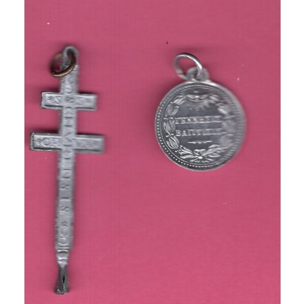 Das Kreuz ist ca. 4,7 cm lang, die Medaille hat einen Durchmesser von ca, 1,7 cm. Vorne ist der im Wasser stehende Jesus und noch eine Figur (Johannes?) drauf und hinten ein kyrillischer Text. Beide Teile haben eine Anhängeröse.