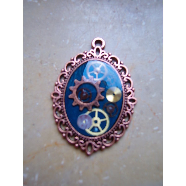 Ovaler, kupferfarbener Anhänger, in dessen Inneren ich kleine Zahnrädchen mit Kunstharz eingefasst habe. Es handelt sich tw. um Original Uhrenteile in verschiedenen Farben (silber, kupfer, gold).