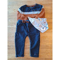 Set aus dunkelblauer Hose mit Longsleeve mit blauen, cognacfarbenen und grauen Streifen. Dazu ein passendes Halstuch zweiseitig tragbar (grauer ... mehr